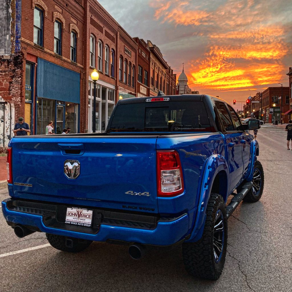 We took one of our awesome new 2022 Dodge Ram Trucks that is a #BlackWidowTruck and it sure looks FINE with the #OklahomaSunset and #ChooseGuthrie as it’s backdrop. Cruising this puppy to downtown Guthrie was smooth as butter and this V8 purrs like a freshly fed kitten. The studded fenders make for an aggressive look as well as these blue custom wheels and beefy BF Goodrich tires which allow for a very clean, smooth and quiet ride. Find more information on this and many of our other #BlackWidowTrucks at #JohnVanceAutoGroup #VanceCDJR #VanceChryslerDodgeJeepRam
