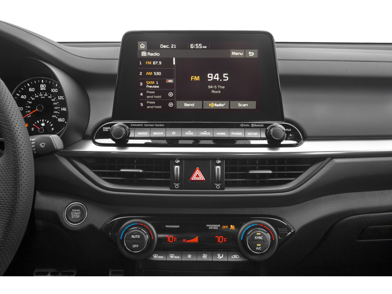 GT-LINE PREMIUM PACKAGE Power Sunroof, Overhead LED Front & Rear Reading Lamps, 10-Way Power Driver Seat, Radio: AM/FM/MP3 harman/kardon® Premium Audio System, 320 watts, 8 speakers, Clari-Fi, UVO eServices w/voice recognition, SiriusXM satellite radio and 2 USB charger ports (front/center console). Kia GT-Line with Aurora Black exterior and Black interior features a 4 Cylinder Engine with 147 HP at 6200 RPM*.